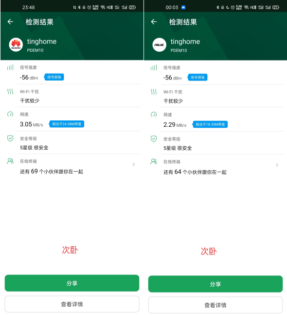 此外,在厨房、主卧、次卧三个地点的测试中,荣耀路由3的网速均优于华硕A86U,手机网速更快,整体信号更强。同时,在时延、信号强度、网页体验、宽带下载速度、视频播放等方面,荣耀路由3的穿墙效果也给笔者带来了极大的惊喜。